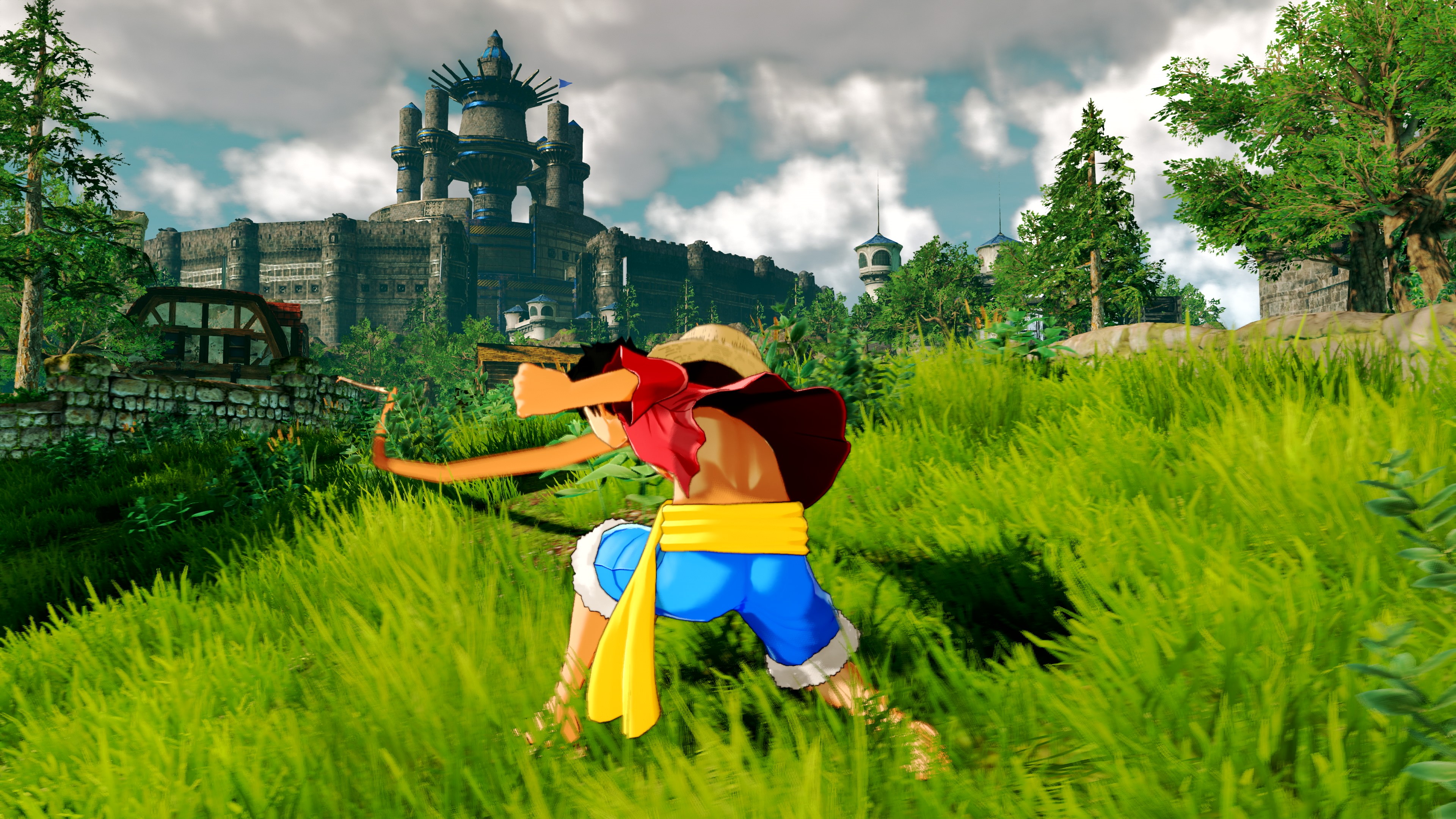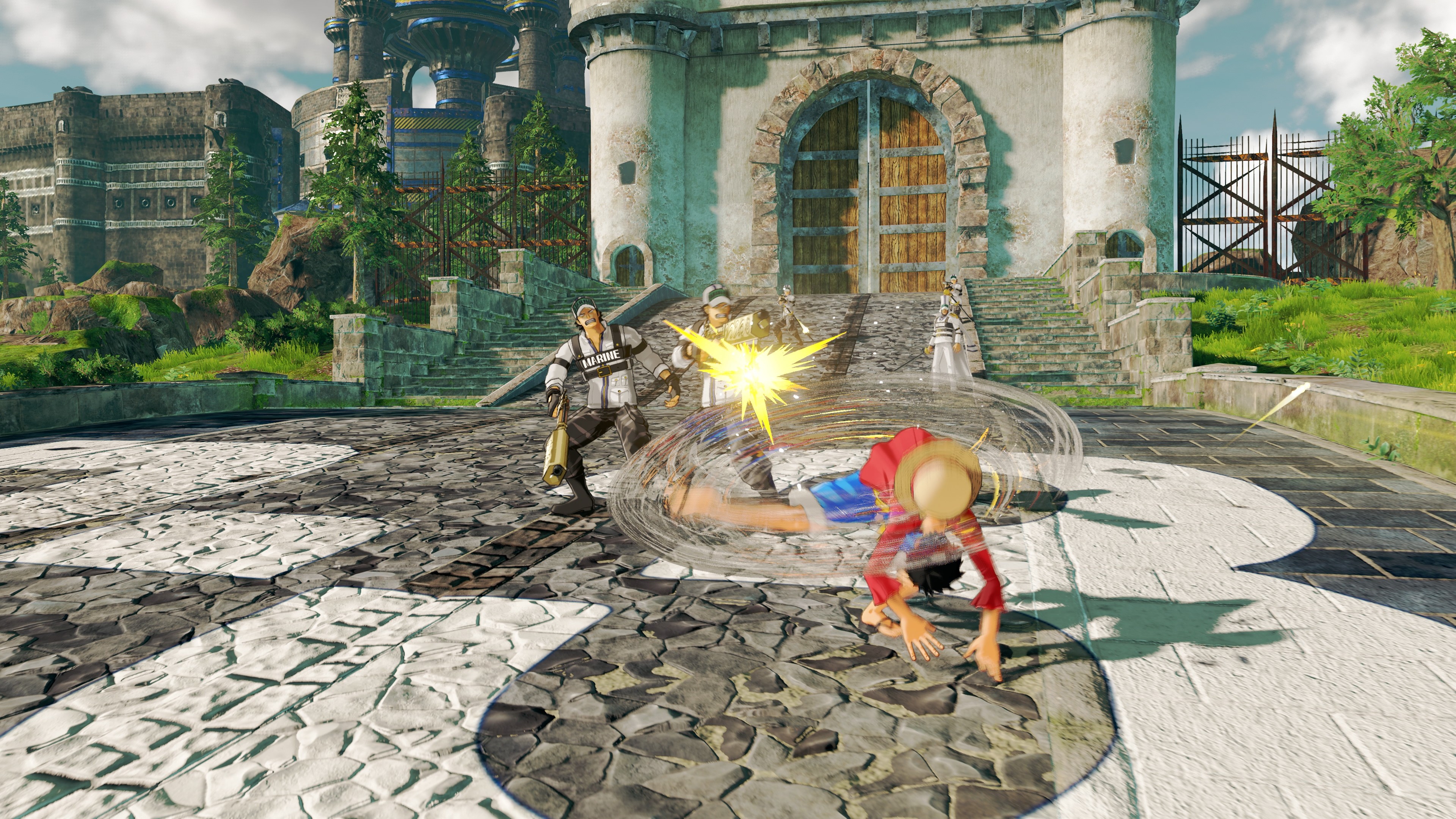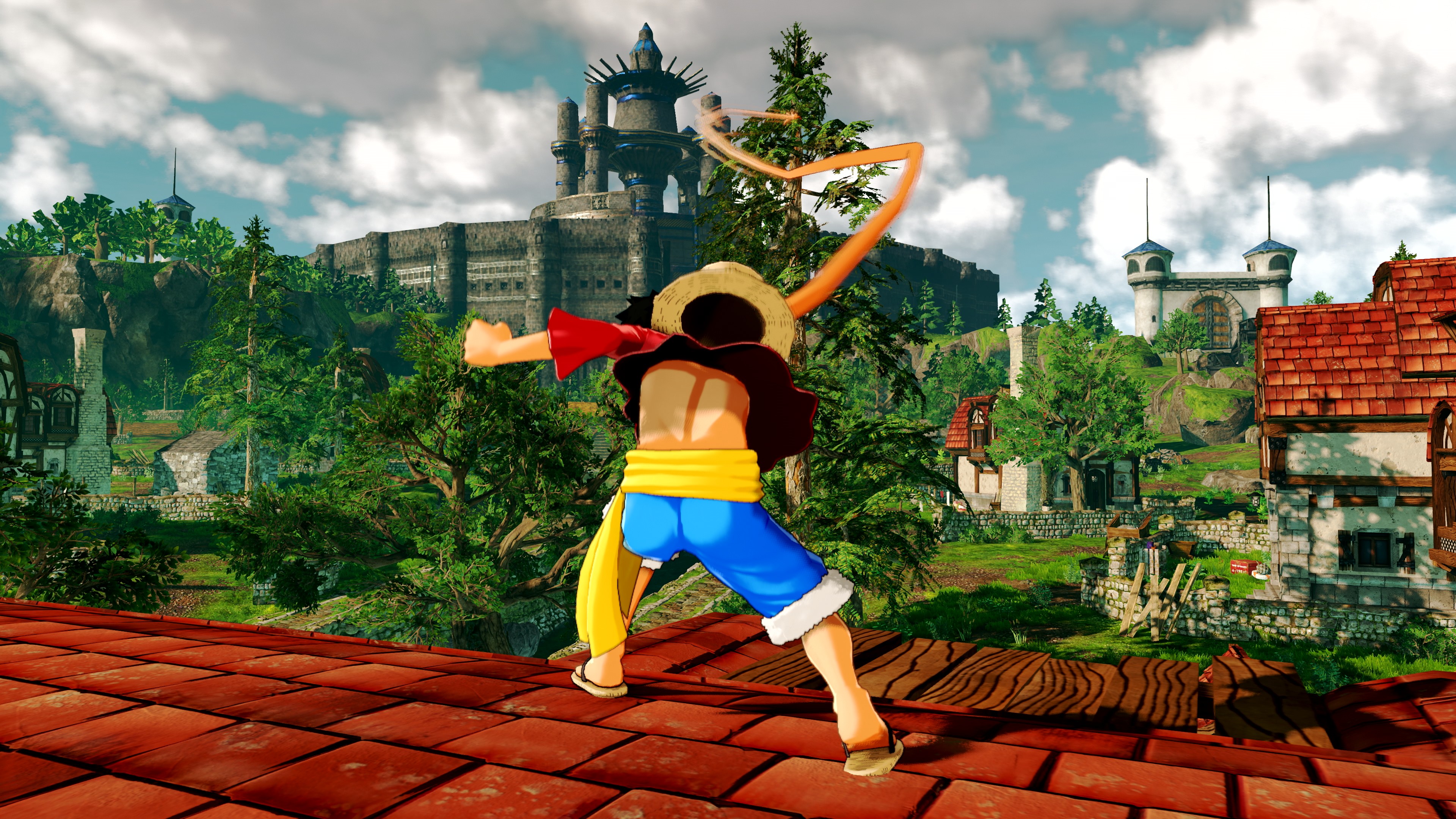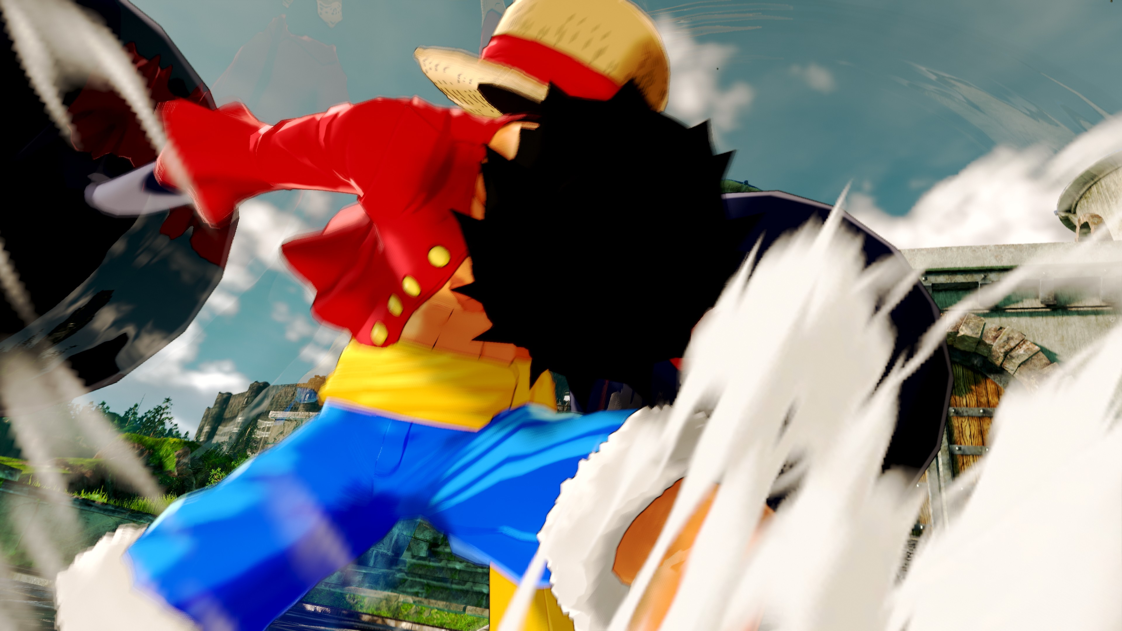 Die Screenshots zeigen verschiedene Aktionen von Ruffy, einschließlich Gum-Gum Rocket, um durch den Himmel zu fliegen und sich mit Luffys dehnbaren Armen auf Distanzobjekte zu bewegen, bevor sie sich ihm nähern können. Mit dieser Fähigkeit kann Ruffy höher springen und mehrere Gegner gleichzeitig angreifen.